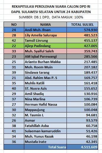 Sementara itu, total untuk kabupaten kota di Sulsel, Tamsil mengumpulkan 455.137, yang mengantarkannya menjadi salah satu senator dari Sulsel, bersama Andi Muh Ihsan, Lily Amelia Salurapa, dan Ajiep Padindang.