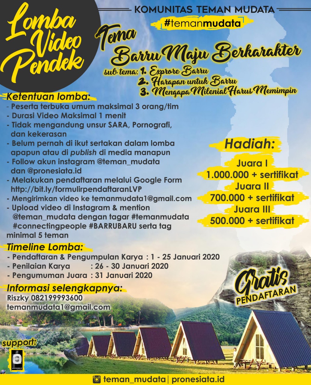 Lomba video pendek ini mengangkat tiga sub tema yaitu, Eksplor Barru, Harapan untuk Baru, dan Mengapa Milenial Harus Memimpin. Batas pengiriman video, 25 Januari 2020.