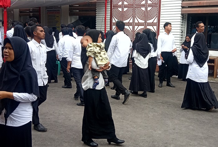 RAKYATKU.COM,GOWA - Perempuan itu tak canggung. Di tengah peserta ujian CPNS, dia jadi perhatian. Tanpa malu menggendong anaknya, berusia sekitar 2 tahun.