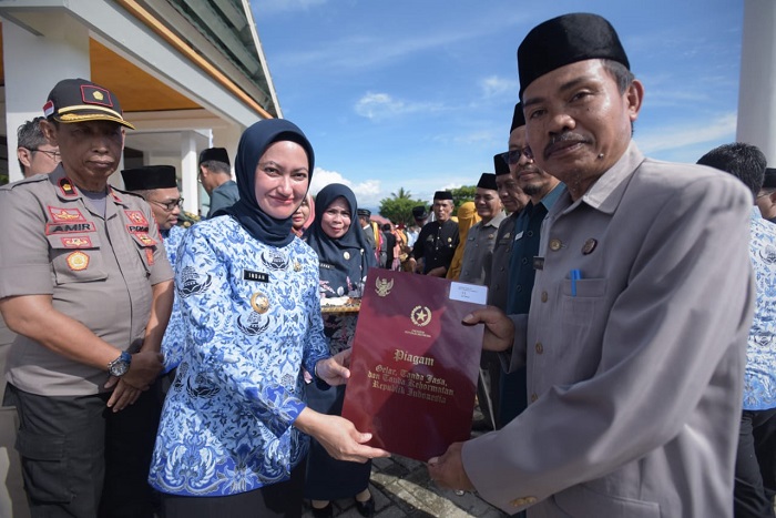 Kepada penerima tanda kehormatan Satyalancana Karya Satya, Bupati Indah berpesan, penghargaan yang diterima tentu telah melalui proses perjuangan dan pengabdian yang panjang. Untuk itu jangan dinodai dengan perbuatan-perbuatan yang melanggar aturan sebagai ASN.