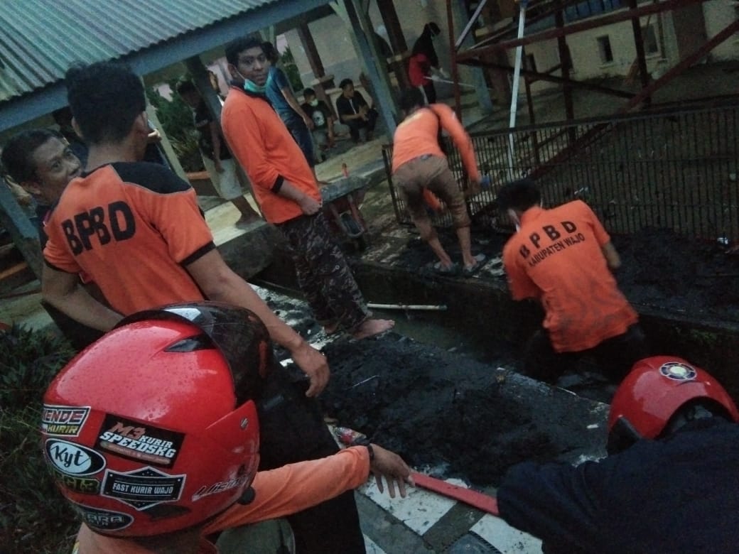 Tim Reaksi Cepat (TRC) Badan Penanggulangan Bencanan Daerah (BPBD) Kabupaten Wajo diturunkan untuk menyedot air dan membersihkan sisa lumpur. (Rasyid/Rakyatku.com)