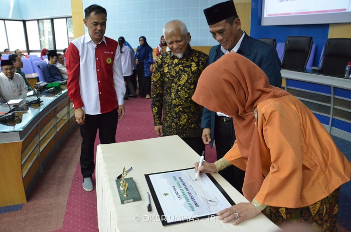 Kepala BPJPH, Prof Ir Sukoso MSc PhD hadir langsung meresmikan PPH Unhas. Ditandai penandatanganan nota kesepahaman (MoU). Prof Dwia juga membubuhkan tanda tangannya. Acara berlangsung di gedung rektorat lantai 2.