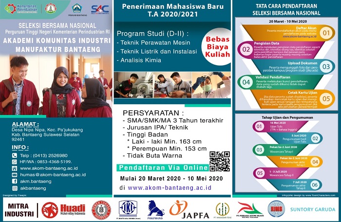 RAKYATKU.COM,BANTAENG - Akademi Komunitas Industri Manufaktur Bantaeng membuka penerimaan mahasiswa baru tahun ajaran 2020/2021.