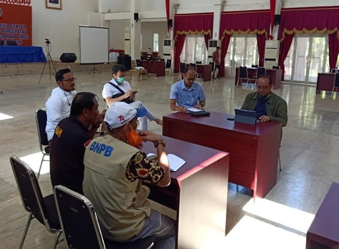 RAKYATKU.COM,MAKASSAR - Gugus tugas penanganan Covid-19 mempraktikkan social distancing. Mereka duduk berjauhan saat rapat di Baruga Karaeng Pattingalloang, Sabtu (21/3/2020).