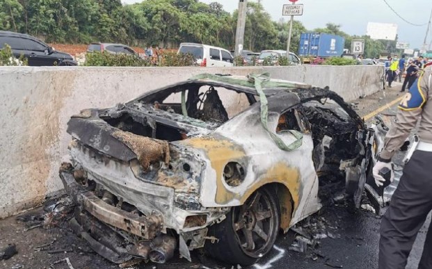 Mobil itu melaju di lajur 4. Tiba-tiba kendaraan menabrak pembatas tol dan terbakar.