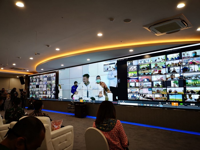 Video conference kali ini diikuti 332 titik yang menggambarkan kabupaten yang sedang panen padi dan jagung. Ada 12 bupati yang turut bergabung.