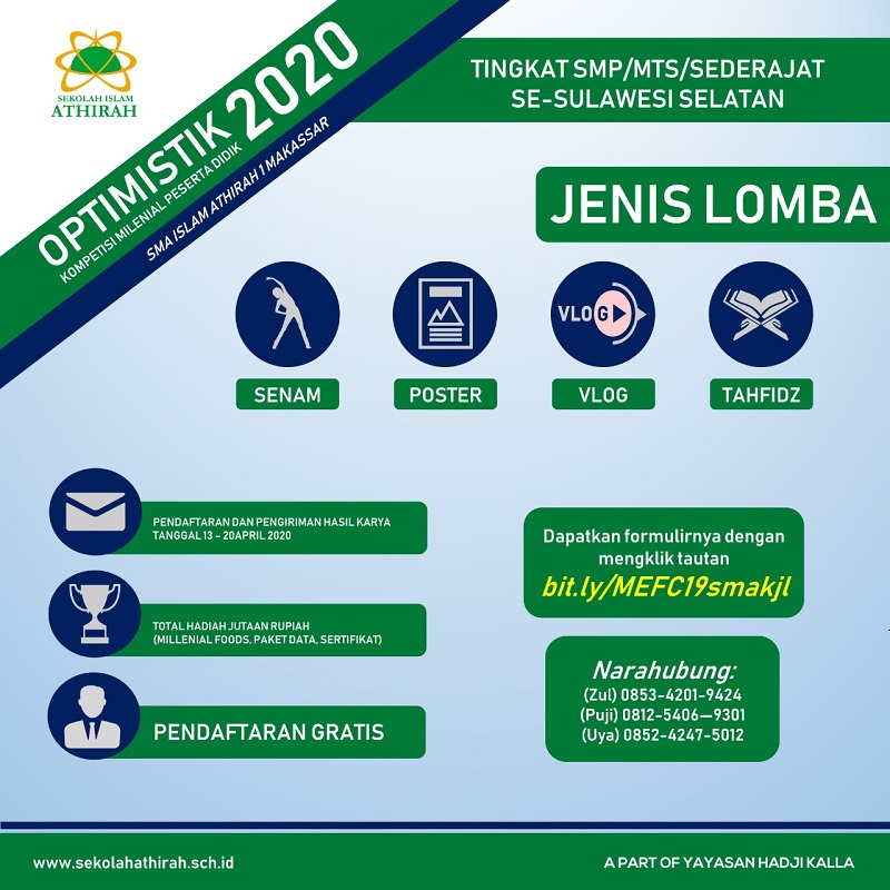 Optimistik 2020 diperuntukkan bagi siswa SMP-MTs dan sederajat se-Sulawesi Selatan. Pendaftaran telah dibuka sejak Senin (13/4/2020). Ditutup pada Senin (20/4/2020).