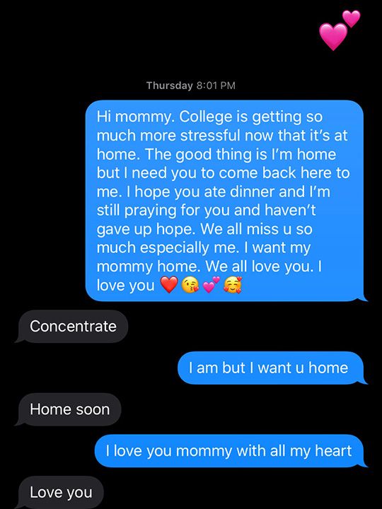 "Aku masih berdoa agar kamu pulang dengan selamat. Aku membutuhkanmu, Bu," pesan Minnoli pada 25 Maret.