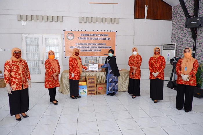 Bantuan tersebut diserahkan langsung Ketua DWP Sulsel, Sri Rejeki Hayat kepada perwakilan lima rumah sakit rujukan penanganan Covid-19 di Kota Makassar. Antara lain RSUP dr Wahidin Sudirohusodo, RS Universitas Hasanuddin, RSKD Dadi, RSUD Sayang Rakyat, serta RSUD Labuang Baji.