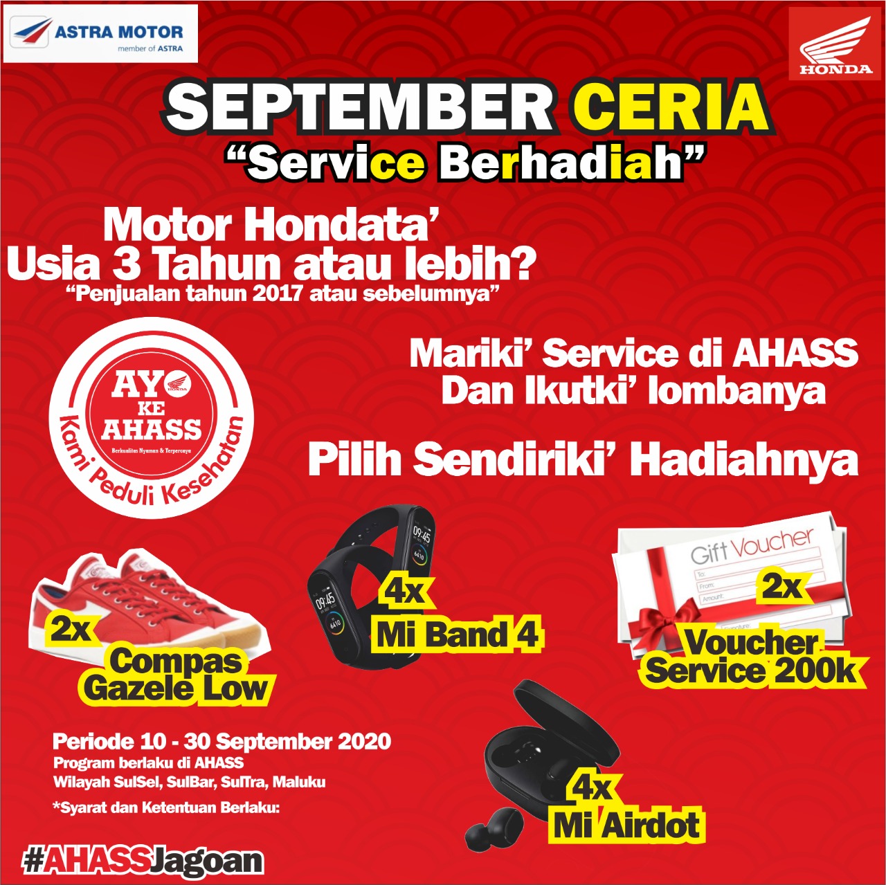 Melalui Astra Honda Authorized Service Station (AHASS), mereka bagi-bagi hadiah berupa Smartwatch Mi Band 4, Sneakers kece, Mi Airdots, serta voucher service senilai Rp200 ribu. Diberikan kepada konsumen terpilih yang melakukan servis pada periode 10-30 September 2020.